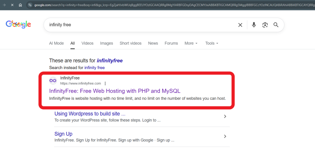 - Choose the free hosting plan and get a domain name like yourname.infinityfree.me.